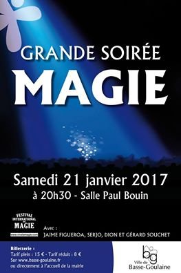 Ce spectacle sera unique à plus d'un titre. Serjo, le magicien argentin se produit très très peu en France et uniquement avec l'équipe du Festival International de Magie. C'est donc une chance de le voir à Basse Goulaine. Dion et Jaime Figueroa sont aussi deux artistes qui se produisent rarement en France. Les photos vont suivre sous peu... A suivre donc...