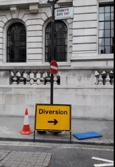 Un clin d'oeil : Même les travaux dans les rues empruntent involontairement au langage des magiciens des éléments dialectiques pour orienter les passants. La photo ci dessous est amusante de ce point de vue... Détournement d'attention, misdirection ou tout simplement "regardez ici pendant que le magicien fait autre chose..."... A l'instar d'un Mr Jourdain qui fait de la prose sans le savoir, les anglais utilise le langage magique dans la vie quotidienne sans le savoir aussi...