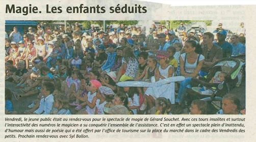 Au vu de l'article, il est facile de certifier que le journaliste à vu le spectacle. En effet, la poésie, les effets magiques insolites, et l'humour sont les composantes essentielles des spectacles de Gérard Souchet. Merci madame la journaliste ou monsieur le journaliste pour cet article épatant. Gérard me demande de vous transmettre ses remerciements les plus cordiaux et les plus enchantés.
