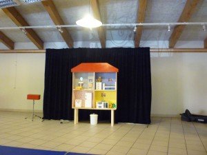 C'est complet !!! le spectacle va démarrer dans 2h00. L'installation est en plein bouillonnement.... et pourtant, un petit vent de sérénité se fait sentir... Le contenu du spectacle est fascinant. Derrière l'image de cette petite maison, c'est la visite de chaque pièce avec de jolies histoires à l'intérieur qui s'y cache.... et là, il faut bien le dire la recherche porte ses fruits. Même si on ne peut jamais être certains du résultat, le scénario, le propos, bref l'ensemble est bien en place.